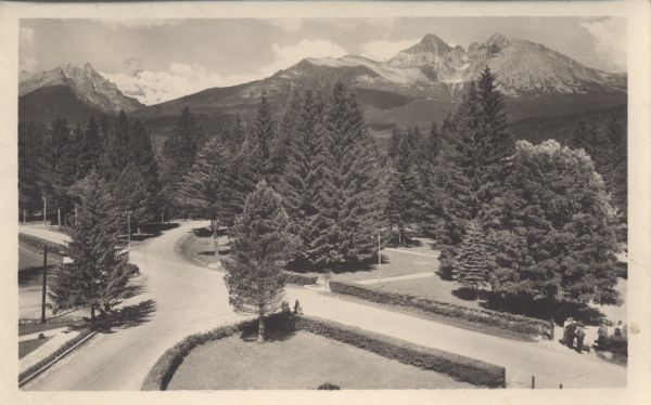 Tatrzańska Łomnica. Widok z hotelu Łomnica na Drogę Wolności i park. W tle Sławkowski Szczyt, Łomnica i Kieżmarski Szczyt.