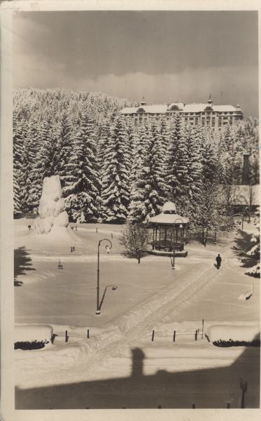 Tatrzańska Łomnica. Park zdrojowy, w tle Grand Hotel Praga w zimowej scenerii.