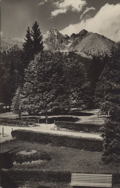VYSOKÉ TATRY - Tatr. Lomnica - park, v pozadí Lomnickę 2634 m a KeŸmarskę čtít 2556 m
