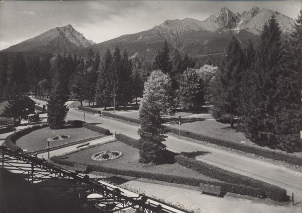 Tatrzańska Łomnica. Widok z hotelu Łomnica na Drogê Wolno¶ci i park. W tle Sławkowski Szczyt, Łomnica i Kieżmarski Szczyt.
