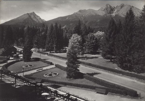 Tatrzańska Łomnica. Widok z hotelu Łomnica na Drogê Wolno¶ci i park. W tle Sławkowski Szczyt, Łomnica i Kieżmarski Szczyt.