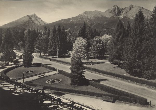 Tatrzańska Łomnica. Widok z hotelu Łomnica na Drogê Wolno¶ci i park. W tle Sławkowski Szczyt, Łomnica i Kieżmarski Szczyt.