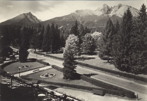 Tatrzańska Łomnica. Widok z hotelu Łomnica na Drogê Wolno¶ci i park. W tle Sławkowski Szczyt, Łomnica i Kieżmarski Szczyt.
