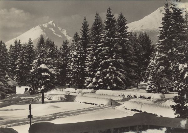 Vysoké Tatry - Tatranská Lomnica. Kúpe”nę park, v pozadí Slavkovskę čtít 2453 m n.m.
