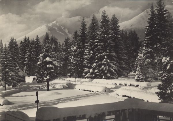 VYSOKÉ TATRY - Tatranská Lomnica. Park. V pozadí Slavkovský ątít (2453 m)