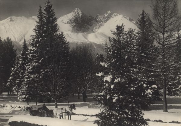 Park w Tatrzańskiej Łomnicy w scenerii zimowej. W tle Łomnica i Kieżmarski Szczyt. Na pierwszym planie, na drodze sanie dwukonne.