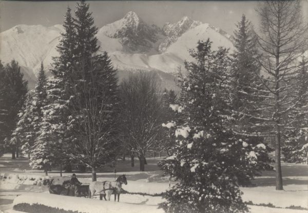 Park w Tatrzańskiej Łomnicy w scenerii zimowej. W tle Łomnica i Kieżmarski Szczyt. Na pierwszym planie, na drodze sanie dwukonne.