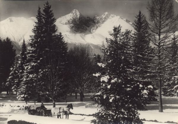 Park w Tatrzańskiej Łomnicy w scenerii zimowej. W tle Łomnica i Kieżmarski Szczyt. Na pierwszym planie, na drodze sanie dwukonne.