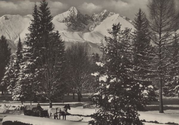 Park w Tatrzańskiej Łomnicy w scenerii zimowej. W tle Łomnica i Kieżmarski Szczyt. Na pierwszym planie, na drodze sanie dwukonne.