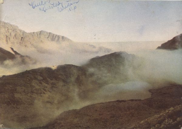 Widok z Wyżniej Koprowej Przełęczy ponad Mały Hińczowy Staw w Dolinie Mięguszowieckiej. W dolinie mgły. Pejzaż letni. Na zdjęciu odręczny napis.