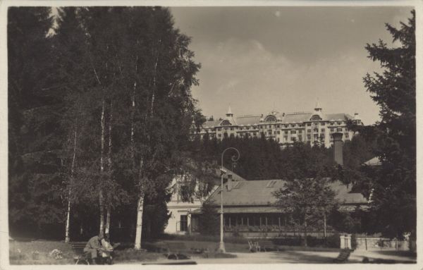 Tatrzańska Łomnica. Park uzdrowiskowy z łaźniami. W tle Grand Hotel Praga.