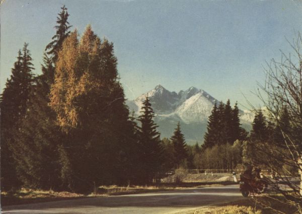 Na pierwszym planie droga przez las, na niej motocykl. W tle Łomnica i Kieżmarski Szczyt.