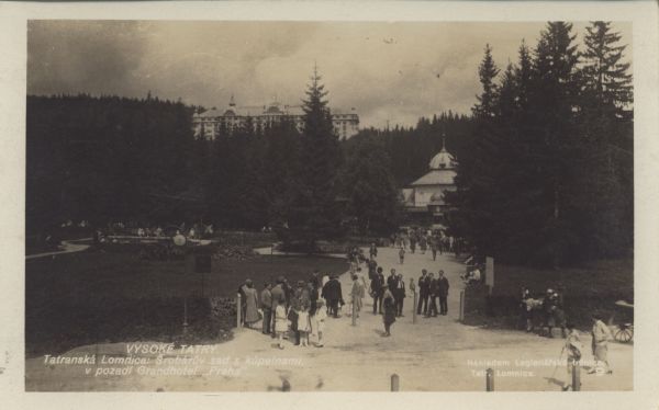 Tatrzańska Łomnica. Park uzdrowiskowy Šrobárov sad z łaźniami. W tle Grand Hotel Praga. W parku spacerują turyści. Na dole wpisany tytuł i nakładca.