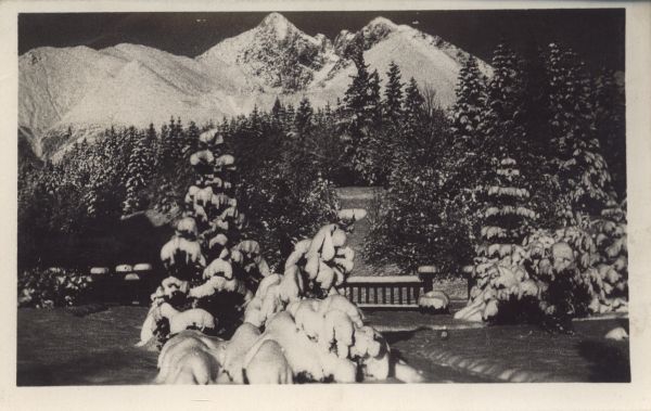 Tatrzańska Łomnica. Park zdrojowy zim±. W tle Łomnica i Kieżmarski Szczyt.