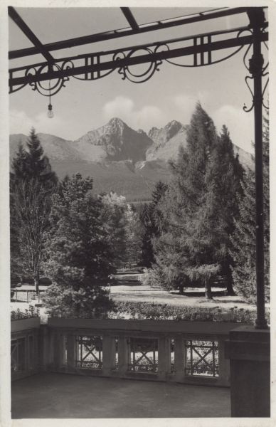 Tatry Wysokie - Tatrzańska Łomnica. Widok z tarasu hotelu Łomnica na park, Sławkowski Szczyt i Łomnicę. (Błędnie podano Sławkowski Szczyt, który nie jest widoczny.)