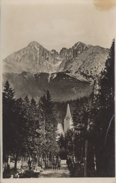 Widok z Tatrzańskiej Łomnicy. Przy ulicy ze szpalerami drzew kościół ewangelicki, przed nim turyści. W tle widoczne: Łomnica i Kieżmarski Szczyt.