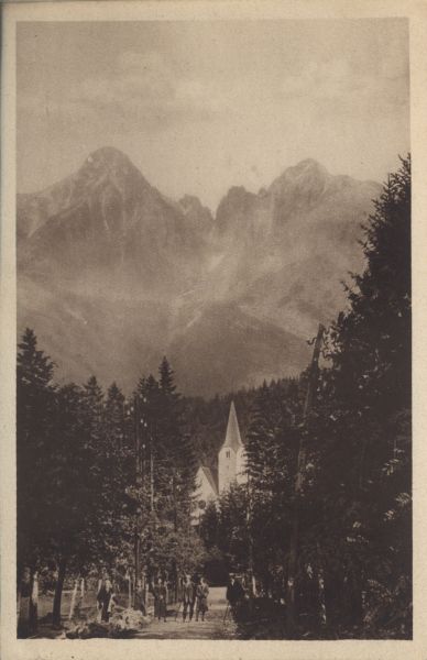 Widok z Tatrzańskiej Łomnicy. Przy ulicy ze szpalerami drzew kościół ewangelicki, przed nim turyści. W tle widoczne: Łomnica i Kieżmarski Szczyt.