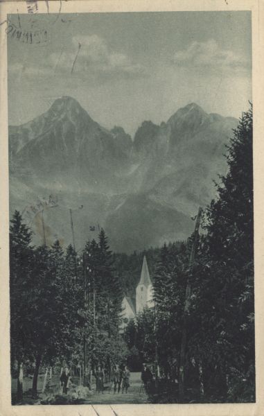 Widok z Tatrzańskiej Łomnicy. Przy ulicy ze szpalerami drzew kościół ewangelicki, przed nim turyści. W tle widoczne: Łomnica i Kieżmarski Szczyt.