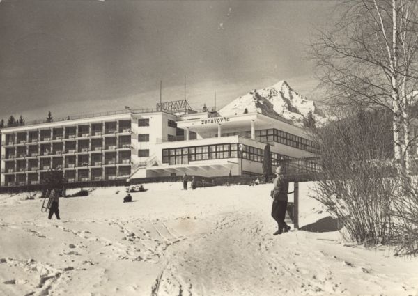 Budynek związkowego domu wypoczynkowego Morawa w Tatrzańskiej Łomnicy i jego otoczenie. W tle Sławkowski Szczyt. Przed budynkiem turyści.