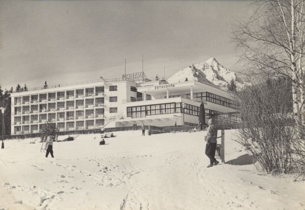 Budynek związkowego domu wypoczynkowego Morawa w Tatrzańskiej Łomnicy i jego otoczenie. W tle Sławkowski Szczyt. Przed budynkiem turyści.