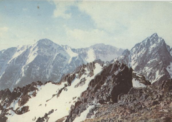 Tatrzański Park Narodowy [Słowacja]. Widok z Łomnickiej Przełęczy na południowy-zachód. Po lewej Sławkowski Szczyt, po środku Gerlach, po prawej Pośrednia Grań. Tytuł również w języku: ros., ang., niem.