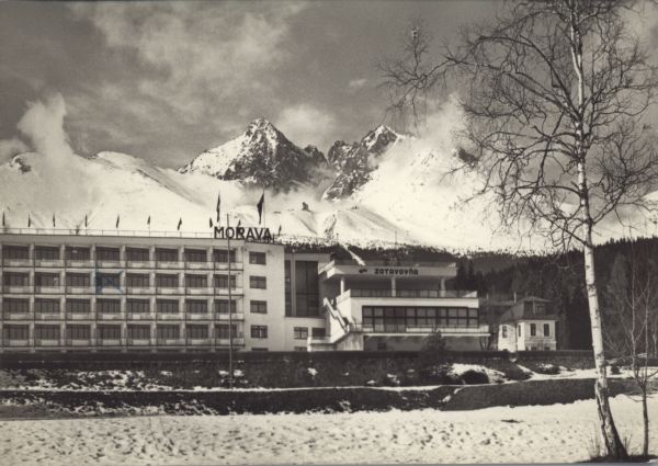 Tatry Wysokie - Tatrzańska Łomnica. Dom wypoczynkowy RZZ Morawa. W tle Łomnica i Kieżmarski Szczyt.