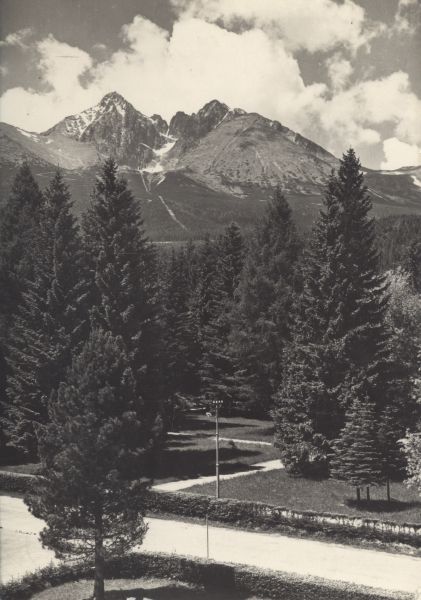 Tatrzańska Łomnica. Widok z hotelu Łomnica na Drogę Wolno¶ci i park. W tle Łomnica i Kieżmarski Szczyt.