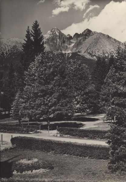 VYSOKÉ TATRY - Tatranská Lomnica Park, v pozadí Lomnickę (2634 m) a KeŸmarskę čtít (2556 m)