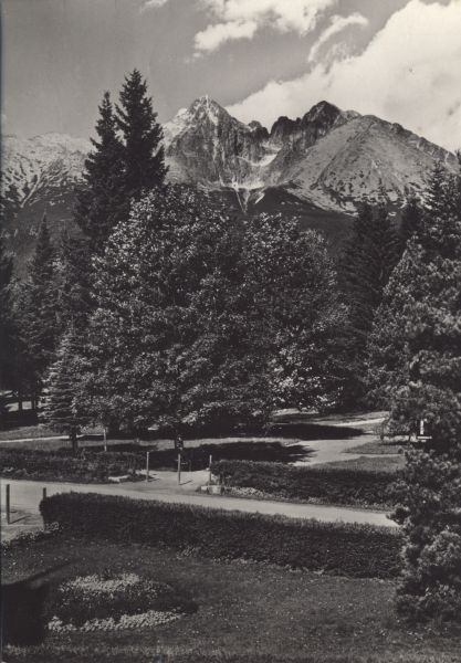 VYSOKÉ TATRY - Tatranská Lomnica Park, v pozadí Lomnickę (2634 m) a KeŸmarskę čtít (2556 m)