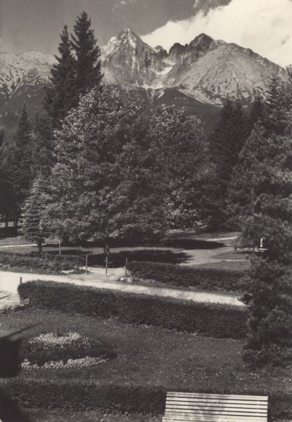 VYSOKÉ TATRY - Tatranská Lomnica Park, v pozadí Lomnickę (2634 m) a KeŸmarskę čtít (2556 m)
