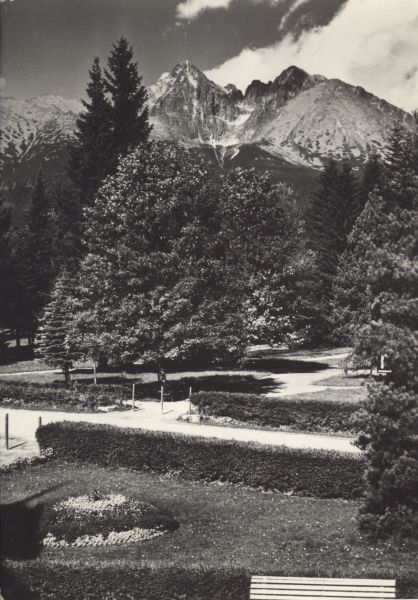 VYSOKÉ TATRY - Tatranská Lomnica Park, v pozadí Lomnický ątít (2634 m) a Keľmarský ątít (2558 m)