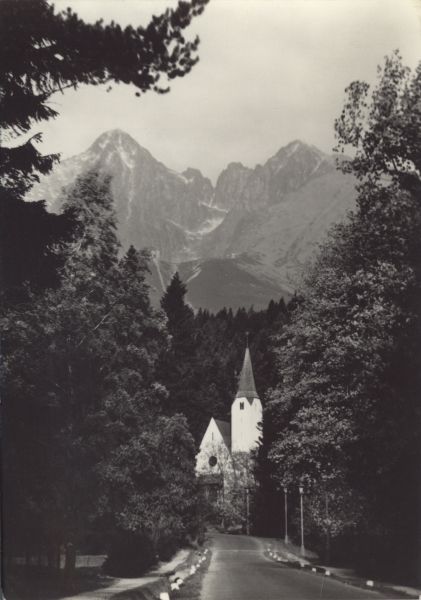 Tatrzańska Łomnica. Widoczny ko¶ciół ewangelicki. W tle Łomnica i Kieżmarski Szczyt.