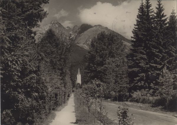 Widok z Tatrzańskiej Łomnicy. Przy ulicy ze szpalerami drzew kościół ewangelicki. W tle widoczne: Łomnica, Widły i Kieżmarski Szczyt.
