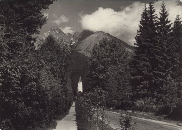 Widok z Tatrzańskiej Łomnicy. Przy ulicy ze szpalerami drzew ko¶ciół ewangelicki. W tle widoczne: Łomnica, Widły i Kieżmarski Szczyt.