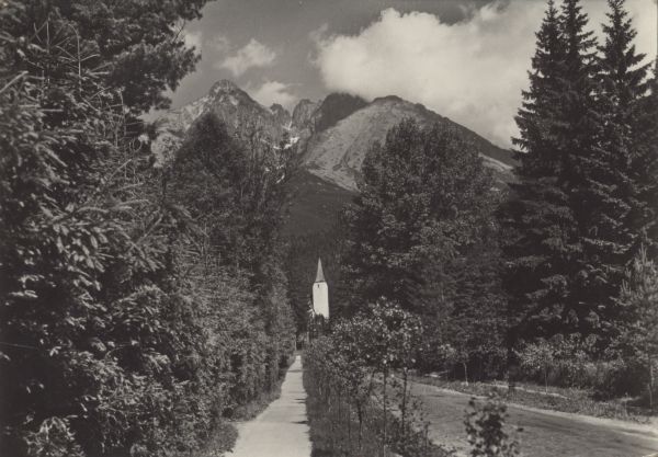 Widok z Tatrzańskiej Łomnicy. Przy ulicy ze szpalerami drzew ko¶ciół ewangelicki. W tle widoczne: Łomnica, Widły i Kieżmarski Szczyt.
