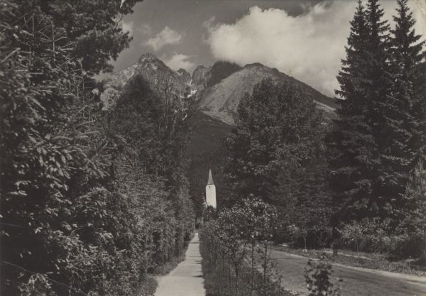 Widok z Tatrzańskiej Łomnicy. Przy ulicy ze szpalerami drzew ko¶ciół ewangelicki. W tle widoczne: Łomnica, Widły i Kieżmarski Szczyt.