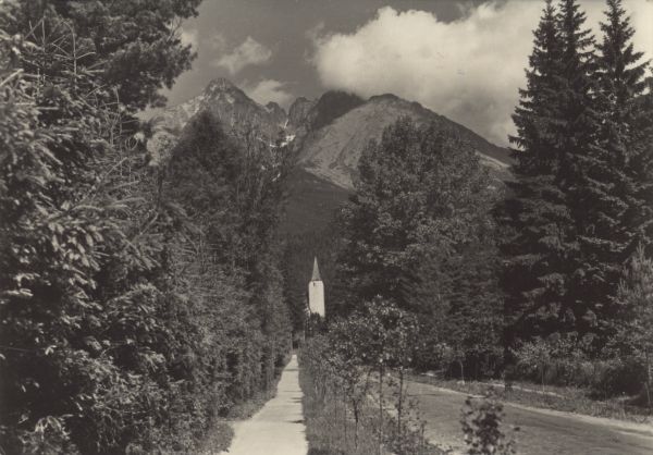 Widok z Tatrzańskiej Łomnicy. Przy ulicy ze szpalerami drzew ko¶ciół ewangelicki. W tle widoczne: Łomnica, Widły i Kieżmarski Szczyt.