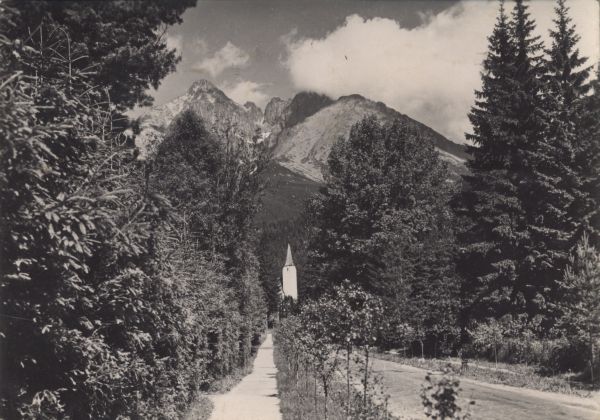 Widok z Tatrzańskiej Łomnicy. Przy ulicy ze szpalerami drzew ko¶ciół ewangelicki. W tle widoczne: Łomnica, Widły i Kieżmarski Szczyt.