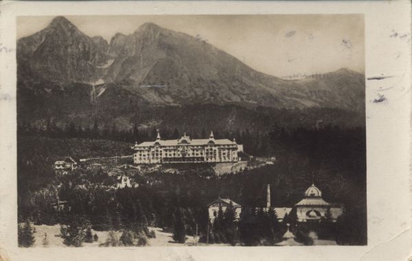 Widok z praku zdrojowego na Grand Hotel Praha w Tatrzańskiej Łomnicy. W tle Łomnica.