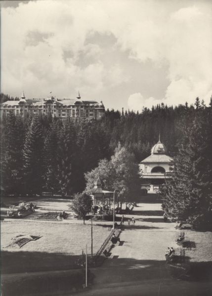 Tatrzańska Łomnica. Łazienki w parku uzdrowiskowym, w tle Grand Hotel Praga.