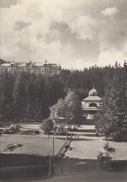 Tatrzańska Łomnica. Łazienki w parku uzdrowiskowym, w tle Grand Hotel Praga.