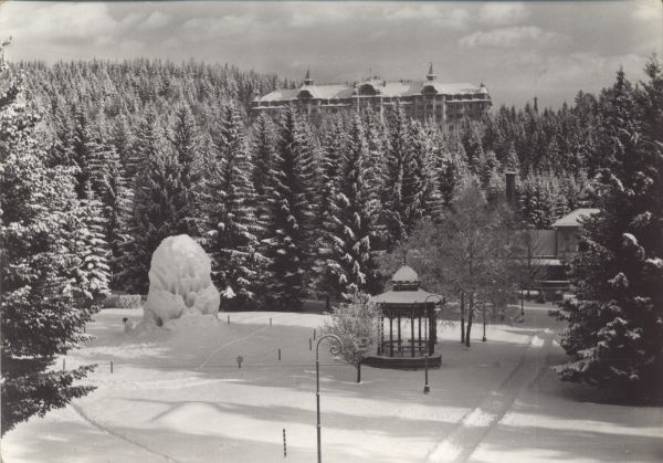 Grand Hotel Praha w Tatrzańskiej Łomnicy w zimie. Widok na park zdrojowy.