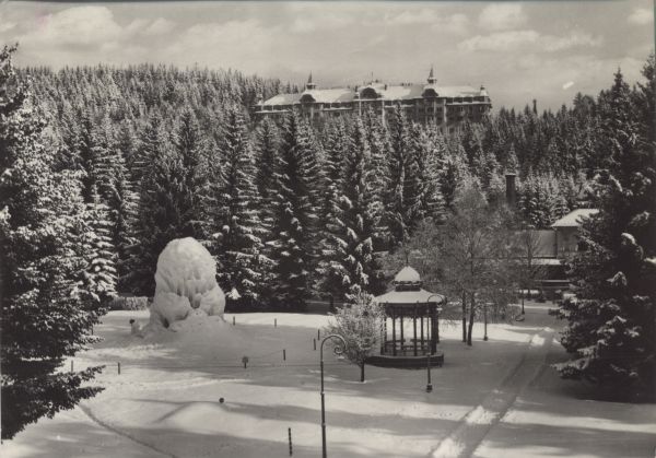 Grand Hotel Praha w Tatrzańskiej Łomnicy w zimie. Widok na park zdrojowy.