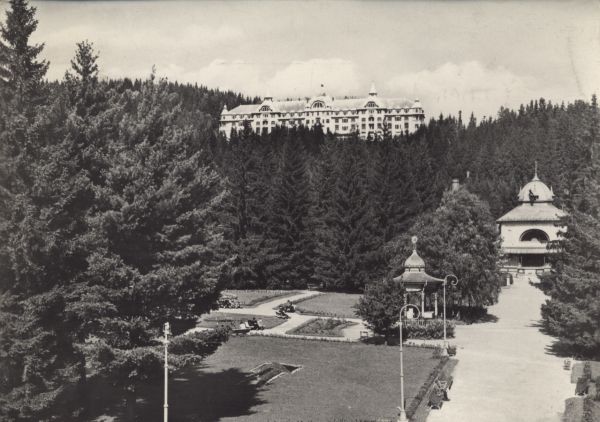 Tatrzańska Łomnica. Łazienki w parku uzdrowiskowym, w tle Grand Hotel Praga.