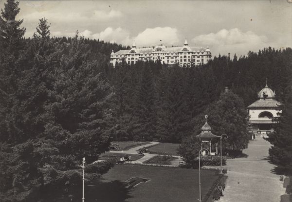 Tatrzańska Łomnica. Łazienki w parku uzdrowiskowym, w tle Grand Hotel Praga.