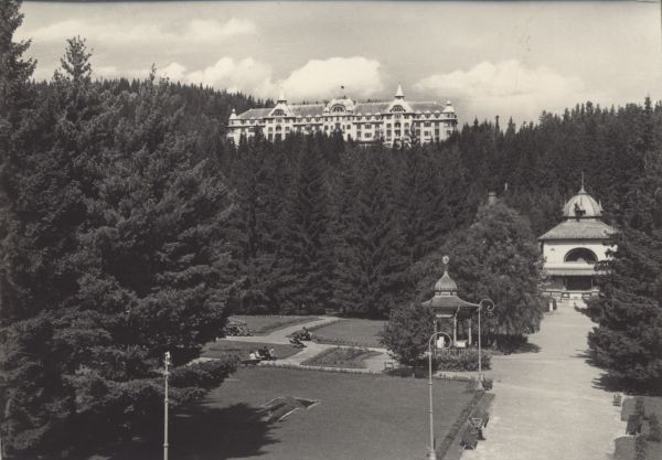 Tatrzańska Łomnica. Łazienki w parku uzdrowiskowym, w tle Grand Hotel Praga.