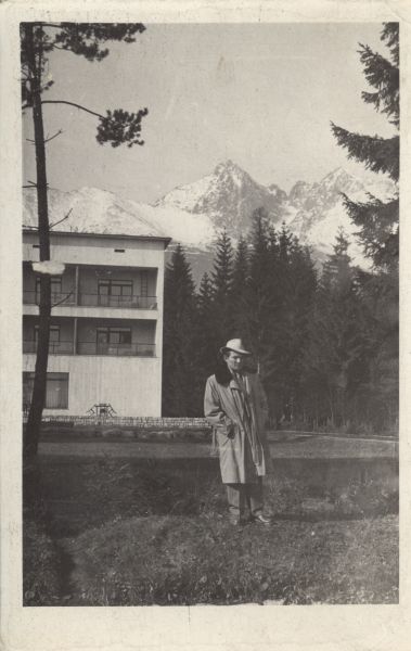 Tatrzańska Łomnica. Na pierwszym planie stoi mężczyzna, w tle widoczny budynek i Łomnica.