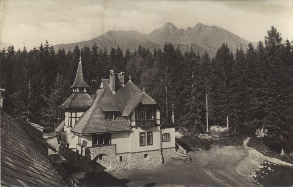 Vysoké Tatry - Tatr. Lomnica. Zotavovňa "Zora". V pozadí Lomnický ątít 2634 m n.m. Keľmarský ątít 2556 m n.m.