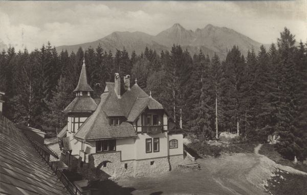 Vysoké Tatry - Tatr. Lomnica. Zotavovňa "Zora". V pozadí Lomnický ątít 2634 m n. m. Keľmarský ątít 2556 m n. m.