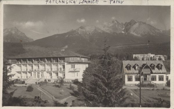 Tatrzańska Łomnica. Pensjonat Dom Spiski wraz z otoczeniem. W tle Sławkowski Szczyt, Łomnica i Kieżmarski Szczyt.